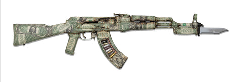 For Symondson, the Dollar is an iconic product within the world as it conjures up a variety of elements ranging from human emotions and behaviors to its influence and place in time. In his work Deuces, an AK47 swathed in American $2 bills, the artist asks the viewer to consider the juxtaposition of currency and the AK47 as it offers an idea of similarity in how each are perceived and used to affect people's lives yet the weapon and currency are both frozen in time and keep their identity but are never to be used again.