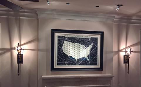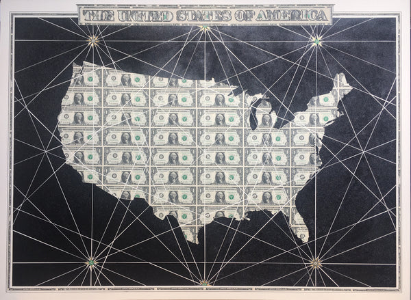Currency Collage + US Dollars + 23.5 Carat Gold Leaf + Gouache & Glitter on Paper Mounted on Aluminum