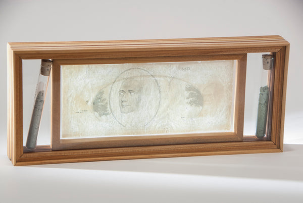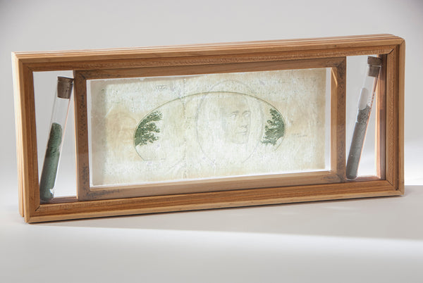 Straight Edge Razor Hand Scraped US Currency, Currency Ink Dust, Test Tubes, Wood Frame with Glass